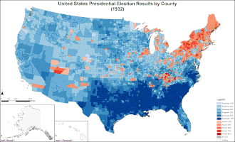 Roosevelt obtuvo la victoria en 2.722 condados, la mayor cantidad de condados ganados por un mismo candidato hasta el momento. De ellos, en 282 nunca antes había ganado un candidato demócrata. Solo 374 condados permanecieron fielmente republicanos. Sin embargo, esa mitad del voto total de la nación se emitió en solo ocho estados (Nueva York, Nueva Jersey, Pensilvania, Ohio, Illinois, Indiana, Michigan y Wisconsin) y en estos estados, Hoover obtuvo 8.592.163 votos. En una región (Suroeste Central), el porcentaje republicano se redujo a 16,21%, pero en ninguna otra sección el partido recibió menos del 30% del voto emitido. Sin embargo, el atractivo relativo de los dos candidatos en 1932 y la disminución del atractivo de Hoover en comparación con 1928 se muestran en el hecho de que el voto republicano aumentó en 1932 en solo 87 condados, mientras que el voto demócrata aumentó en 3.003 condados.