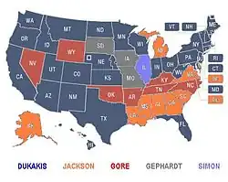 Mapa de las primarias demócratas. Dukakis venció en la mayoría de estados.