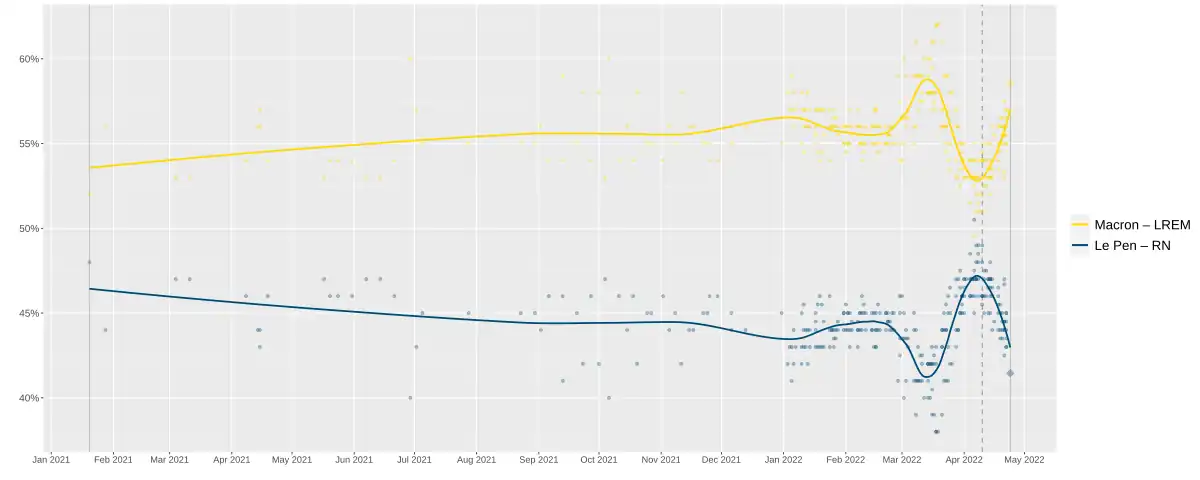 Al no haber ningún candidato con mayoría de los votos emitidos en la primera vuelta, se llevó a cabo una segunda vuelta el domingo 24 de abril de 2022, entre los dos candidatos más votados, Emmanuel Macron y Marine Le Pen.[3]