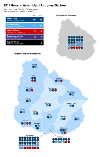 | Elecciones generales de 2014 Presidente y Vicepresidente de la República 30 miembros de la Cámara de Senadores 16 escaños necesarios para la mayoría absoluta 99 miembros de la Cámara de Representantes 50 escaños necesarios para la mayoría absoluta | |||||||||||