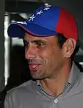 - Henrique Capriles Radonski:[35] abogado egresado de la Universidad Católica Andrés Bello y político, actual gobernador del estado Miranda desde 2008. Exdiputado al Congreso de la República (1999-2000), donde desempeñó el cargo de vicepresidente del Congreso y de presidente de la Cámara de Diputados, fue alcalde por dos períodos del Municipio Baruta (2000-2008). Miembro fundador de Primero Justicia, partido que apoya su candidatura, además de Podemos, Patria Para Todos, La Causa R, Cuentas Claras, Electores Libres, Fuerza de la Gente, Dignidad Patriótica, Partido Auténtico Nacional, Voluntad Popular, Proyecto Venezuela, MIN Unidad, Unión Republicana Democrática, Movimiento Ecológico de Venezuela, Piensa en Democracia y Visión Venezuela..