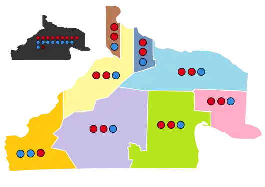 - 24 diputados electos en 8 circuitos electorales de 3 diputados cada uno por sistema d'Hondt con un piso electoral de 22%.