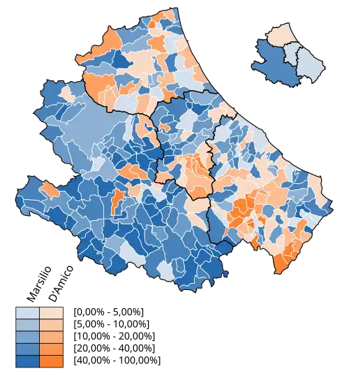 Marco Marsilio fue el candidato presidencial más votado con 327.660 preferencias, obteniendo 11.023 votos adicionales solo para el presidente en comparación con los 316.637 votos de la coalición de centroderecha. Luciano D'Amico obtuvo 284.748 preferencias, con 22.183 votos sólo para el presidente además de los 262.565 votos de las listas que lo apoyaron.