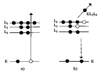La siguiente figura muestra una transición Auger KLL. El primer electrón fue quitado de la capa K. Un electrón L baja a ocupar la vacante y el exceso de energía es trasferido a un segundo electrón L, el cual es emitido del átomo.