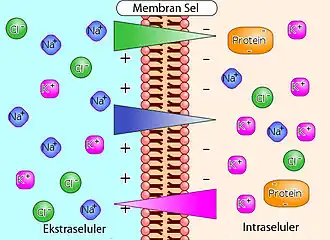 Como resultado de las propiedades de permeabilidad de las membranas plasmáticas, la presencia de moléculas con carga negativa que no se difunden dentro de la célula, y la acción de las bombas de Na+/K+ , hay una distribución desigual de cargas a través de la membrana. Debido a esto, el interior de la célula tiene carga negativa en comparación con el exterior. Esta diferencia de carga es la diferencia de potencial, que en fisiología médica se conoce como el potencial de membrana.[2]