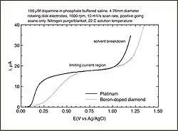 Las inversiones de barrido de potencial, tal como se utilizan en la voltamperometría cíclica, son diferentes para un sistema RDE, ya que los productos del barrido de potencial se alejan continuamente del electrodo. Una inversión produciría una curva iE similar, que coincidiría estrechamente con la exploración directa, excepto por la corriente de carga capacitiva. No se puede usar un RDE para observar el comportamiento de los productos de reacción del electrodo, ya que se barren continuamente del electrodo. Sin embargo, el electrodo de disco-anillo rotatorio es muy adecuado para investigar esta reactividad adicional. La corriente máxima en un voltamograma cíclico para un RDE es una región similar a una meseta, gobernada por la ecuación de Levich . La corriente límite suele ser mucho más alta que la corriente máxima de un electrodo estacionario, ya que el transporte de masa de los reactivos se estimula activamente por el disco rotatorio y no solo se rige por la difusión, como es el caso de un electrodo estacionario. Cualquier electrodo de disco puede, por supuesto, también usarse como electrodo estacionario usándolo con el rotor apagado.