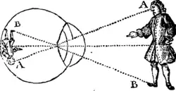 Ilustración de Los elementos de la filosofía de Newton (1738) sobre la visión del ojo humano.Cap. VI. — Espejos, telescopios. De las razones que dan las matemáticas de los misterios de la visión; que estas razones no son suficientes. — Espejo plano. Espejo convexo. Espejo cóncavo. Explicaciones geométricas de la visión. No hay una conexión inmediata entre las reglas de la óptica y nuestras sensaciones. Ejemplo en evidencia.