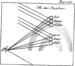 Cap. X. — Continuación de las maravillas de la refracción de la luz. Que un solo rayo de luz contiene en sí mismo todos los colores posibles. ¿Qué es la refrangibilidad? Nuevos descubrimientos. — La imaginación de Descartes sobre los colores. Error de Malebranche. El experimento y la demostración de Newton. Anatomía de la luz. Colores en los rayos primitivos. Vanas objeciones contra estos descubrimientos. Críticas aún más vanas. Experiencia Significativa.Ilustración de Los elementos de la filosofía de Newton (1738) sobre el arcoíris.