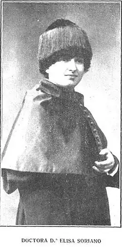 - ↑ La revista Redención, una de las primeras publicaciones feministas españolas, se hicieron eco de la noticia : “La doctora Soriano tiene el honor de ser la primera mujer que desempeña un cargo oficial en el Hospital [...] Puede la JUF sentirse orgullosa en tener por presidenta a una joven de tan relevantes prendas como las que adornan a la señorita Soriano”. Otra citada laudatoria fue la escrita por el director de la publicación El Monitor Sanitario, Luis Ortega Morejón, escribió una biografía sobre ella, en la que aseguraba que Elisa era quién le había proporcionado los datos y que la ella era la primera mujer que aparecía en su revista gracias a: “sus condiciones de capacidad, de preparación, de inteligencia y de energía para cumplir en todo momento las difíciles misiones que han venido pesando sobre su actuación y desenvolvimiento”. Además, también habla sobre el importantísimo logro por el cual había sido homenajeada con el cargo de profesora en el Hospital Clínico de la Facultad de Medicina y de la que dimitió, según Luis Ortega Morejón, debido al machismo de la época: “Su espíritu fino y cultivado, la íntima convicción de que sabe cumplir con sus deberes durante tantos años experimentados, la limpieza de su conciencia en cuantos actos realizó, no se avenían a someterse a la descarga del mal humor de algún Catedrático, que no tenía por qué soportar, y reflexivamente, no como hecho de momentánea impresión, decidió dimitir el elevado puesto alcanzado. Su hermoso gesto de abandonar el honroso y difícil cargo, codiciado y tentador, la revela como independiente, libre, digna y enérgica, con un alma muy bien templada, que para sí quisieran algunos hombres. Ha demostrado también, en su modo de dejar la enseñanza, que así se enseña”.