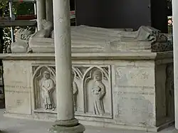 - ↑ Únicamente los altorrelieves verticales de la tumba y la efigie funeraria de Abelardo provienen de la tumba original de 1142. Los demás elementos provienen de diversos monumentos. Ninguno proviene de la Abadía del Paraclet.
