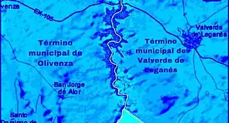 Es el embalse más grande de la comarca de los Llanos de Olivenza. La masa de agua está limitada por la presa que lleva el mismo nombre que el embalse, donde se encuentra la depuradora de agua que abastece tanto al pueblo de Olivenza como al pueblo de Valverde de Leganés.