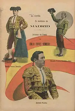 ![]() Contraportada de La Fiesta Nacional (Barcelona), 11 de junio de 1904. Cartel de la retirada del toreo de Emilio Torres "Bombita". Terna formada por Bombita, Bombita chico y Antonio Fuentes. Biblioteca Nacional de España. | ||
