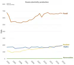 Las emisiones de gases de efecto invernadero de Rusia se encuentran en el cuarto puesto de las más grandes del mundo y se producen principalmente por los combustibles fósiles. Rusia emite alrededor de 1600 megatoneladas (Mt) CO 2eq de gases de efecto invernadero cada año;[1] alrededor del 10% de las emisiones mundiales[2] y, aproximadamente, 40 toneladas por persona. Reducir las emisiones de gases de efecto invernadero y, por lo tanto, la contaminación del aire en Rusia, tendría beneficios para la salud y el ambiente mayores que el costo que significa reducirlas.[3]