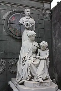 Sepulcro de Emma Nicolay de Caprile en el cementerio de Recoleta. La escultura de mármol, cuyo autor fue Lucio Correa Morales, fue donada por sus alumnas. En ella puede observarse a Emma Nicolay de Caprile enseñándole a leer a su sobrino.[1][2]