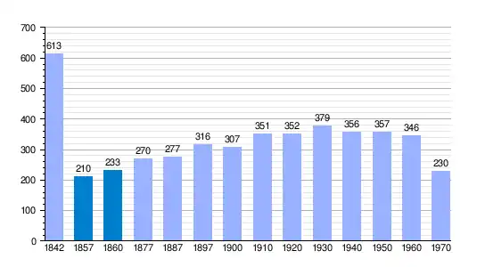 | Gráfica de evolución demográfica de Encinares[3] entre 1842 y 1970 |