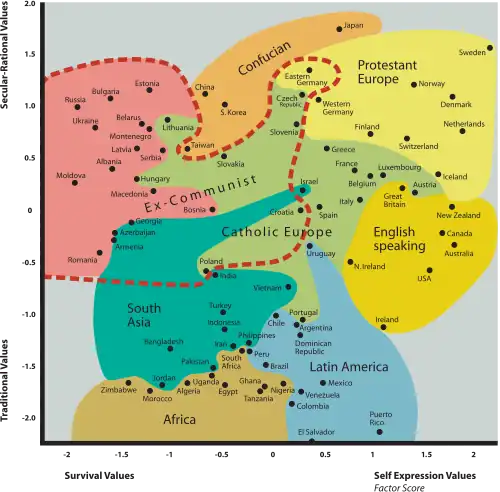 En el mundo, según la encuesta, hay sociedades tradicionales como Marruecos, Argelia, Arabia Saudí, México y gran parte de América Latina, además de Estados Unidos e Irlanda entre los países de habla inglesa, así como sociedades seculares como Japón, Reino Unido, Estonia, Noruega, Suecia, Dinamarca, Alemania Oriental, Nueva Zelanda, etc. También hay sociedades de supervivencia como Rusia, Ucrania, Irán, China y la mayor parte de África. Para los investigadores, Estados Unidos y América Latina son una combinación de sociedad tradicional con sociedad que valora la autoexpresión. Ejemplos de sociedades de autoexpresión son Alemania, Suiza, Estados Unidos e Australia