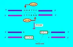 Las enzimas de restricción son endonucleasas provenientes de eubacterias y arqueas que reconocen secuencias de ADN muy específicas.[2] La secuencia de nucleótidos reconocida para escisión por una enzima de restricción se denomina sitio de restricción. Típicamente un sitio de restricción es una secuencia palindrómica de entre cuatro a seis nucleótidos de extensión. La mayor parte de las endonucleasas de restricción escinden a la molécula de ADN bicatenario en forma desigual, dejando extremos complementarios de cadena simple. Estos extremos pueden luego reconectarse a través de un proceso de hibridación, por lo que son denominados "extremos adhesivos". Una vez apareados, los enlaces fosfodiéster de los fragmentos pueden ser unidos por medio de una ADN ligasa.