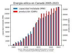 La energía eólica tiene una historia en Canadá que se remonta a muchas décadas, especialmente en las granjas de Praderas. A fecha de diciembre de 2017, la capacidad de generación de energía eólica era de 12 252 gigavatios (GW), lo que representa aproximadamente el 6 % de la demanda eléctrica de Canadá.[1]La Asociación Canadiense de Energía Eólica ha delineado una estrategia futura para la energía eólica que alcanzaría una capacidad de 55 GW para 2025, cubriendo el 20 % de las necesidades energéticas del país.[2]
