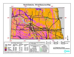 A finales de 2017, se habían instalado 2996 megavatios (MW) de capacidad de generación para energía eólica en Dakota del Norte .[1] La capacidad adicional había estado limitada por las restricciones de la línea de transmisión hasta la finalización de una línea de transmisión desde Fargo hasta el centro de Minnesota en 2015.[2] Otros parques eólicos se planean una vez más para el estado.[3]