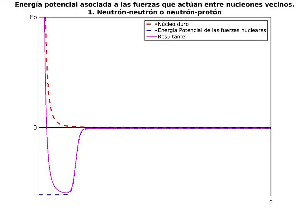 La superposición de los dos términos de energía potencial proporcionará una curva de energía potencial resultante análoga en términos cualitativos a la existente en la interacción entre dos átomos. En consecuencia, aparecerá un pozo de potencial que vendrá caracterizado por un mínimo. Su posición determinará la existencia de un radio efectivo del nucleón y una energía asociada a la profundidad del mismo. La composición de estos dos términos de energía potencial, la energía potencial nuclear y el "núcleo duro", originará una curva de energía potencial resultante aplicable a las interacciones entre dos neutrones o entre un protón y un neutrón.[40]