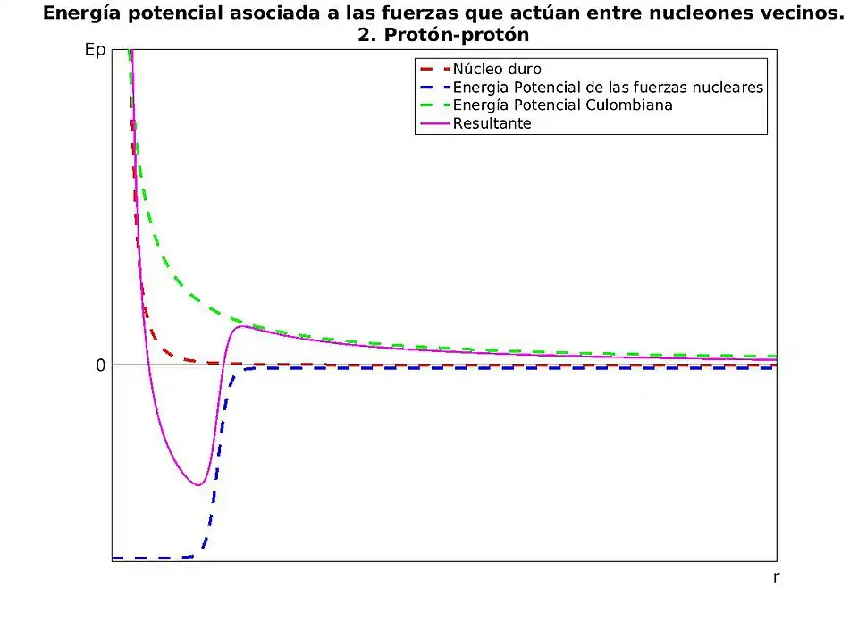 y se incorporará a las contribuciones de la proporcionada por las fuerzas nucleares atractivas y al término repulsivo de Jastrow, para componer la expresión completa de la energía potencial que surge al estudiar la interacción entre los nucleones. En el caso de la interacción protón-protón, la energía potencial del proceso será la superposición de tres componentes de energía potencial, la debida a las fuerzas nucleares, la correspondiente al "núcleo duro" y la debida a la repulsión electrostática.[41]