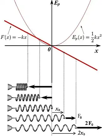 Este trabajo representa la energía potencial Ep que tiene el bloque en la posición x. Para ello se ha convenido en asociar la Ep=0 a la posición x=0 (origen de la función potencial). Si ahora se calcula el trabajo para desplazar el bloque de una posición a otra , se comprueba que este solo depende de las posiciones inicial y final:[22]