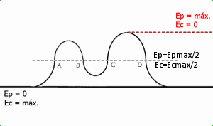 El dibujo de una montaña rusa en un plano se puede interpretar como la representación de la función energía potencial de un cuerpo en el campo gravitatorio. Cuanto más sube un móvil la montaña rusa, mayor es su energía potencial y menor su energía cinética , y por tanto se desplaza más lento. En los máximos relativos de dicha función (los picos de la montaña rusa) su energía potencial será más elevada que en los puntos de su entorno. Estos puntos se llamarán puntos de equilibrio mecánico inestable, ya que si se deposita en ellos un objeto con por poco que se desplace de ese punto, el objeto siempre tenderá a alejarse. Por otro lado, si lo situamos en los mínimos de la función (los valles de la montaña rusa), el móvil que los abandonase en uno u otro sentido siempre tenderá a volver hacia ellos, son los puntos llamados puntos de equilibrio estable.[15] Como la energía mecánica del cuerpo se conserva , en la figura.