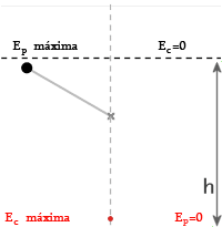 En el caso de un péndulo, cuyo movimiento puede alcanzar una altura medida a partir de su posición más baja, también se puede comprobar la ley de conservación de la energía. En los puntos más altos (altura h), donde la energía potencial es máxima, la velocidad del péndulo es nula y el movimiento cambia de sentido. Por otro lado, la posición más baja, que se puede llamar , será aquella con una mayor energía cinética y velocidad máxima pero con una energía potencial mínima. La posición se podrá tomar como origen de la energía potencial (se le puede asociar una energía potencial nula).