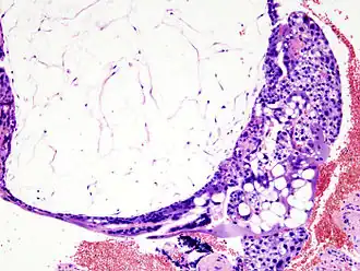 ![]() Corte histológico de una mola hidatiforme teñido con hematoxilina y eosina. Se ve una vellosidad de gran tamaño llena de líquido, con proliferación de células en el trofoblasto que lo rodea visibles como numerosos núcleos violeta. | ||