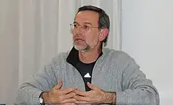 ![]() El profesor de la Universidad de León, Enrique Javier Díez Gutiérrez, impartiendo una conferencia de educación en 2016 | ||