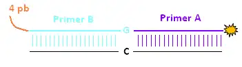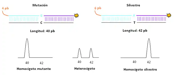 Los otros dos oligonucleótidos (primers B) son iguales y se unen al otro extremo de la cadena, pero se diferencian entre sí en que uno se unirá específicamente al ADN mutado mientras que el otro lo hará a la cadena silvestre, ya que en este caso la zona de hibridación sí contiene la mutación. Otra diferencia entre ambos oligonucleótidos que nos permitirá diferenciar los fragmentos es que tienen unida una cola de longitud variable.