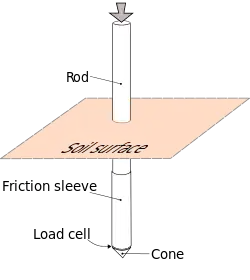 El método de prueba consiste en empujar un cono instrumentado, con la punta hacia abajo, hacia el suelo a una velocidad controlada de 1,5-2,5 cm/s. La resolución del CPT al delinear capas estratigráficas está relacionada con el tamaño de la punta del cono, con puntas de cono típicas que tienen un área de sección transversal de 10 o 15 cm², que corresponde a diámetros de 3,6 y 4,4 cm. Se desarrolló muy temprano un penetrómetro de substracción ultraminiatura de 1 cm² y se usó en un programa de diseño de suelo / estructura de sistema de lanzamiento de misiles balísticos móvil de los EE. UU. (MGM-134 Midgetman) en 1984 en la Earth Technology Corporation de Long Beach, California.
