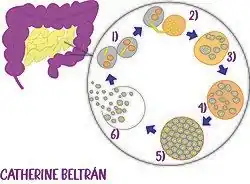 El Ciclo de vida de Enterocytozoon bieneusi. La forma infecciosa de los microsporidios es la espora, que puede sobrevivir durante largo tiempo en el medio ambiente (1). La espora expulsa su túbulo polar e infecta a la célula hospedera donde la espora inyecta el esporoplasma en la célula eucariótica hospedera a través del túbulo polar (2). Dentro de la célula, el esporoplasma sufre multiplicación extensa ya sea por merogonia (fisión binaria) o esquizogonia (fisión múltiple) (3). Este desarrollo ocurre en contacto directo con el citoplasma de la célula hospedera. Ya sea libre en el citoplasma o en el interior de una vacuola parasitófora, los microsporidios se desarrollan por esporogonia en esporas maduras (4). Durante la esporogonia, una pared gruesa se forma alrededor de la espora, que proporciona resistencia a las condiciones ambientales adversas (5). Cuando las esporas aumentan en número y llenan completamente el citoplasma de la célula huésped, la membrana celular se rompe y libera las esporas a los alrededores (6). Estas esporas maduras libres pueden infectar nuevas células continuando así el ciclo.[4]