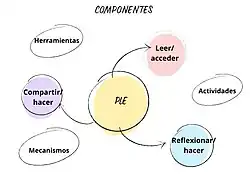 Se puede decir que los entornos personales tienen tres partes: herramientas, recursos o fuentes de información (revistas, blogs, wiki, páginas de revistas de instituciones, entre algunos.) y red personal de aprendizaje o PLN (del inglés Personal Learning Network) que se refiere a toda la red de personas en su conjunto con las que nos mantenemos en contacto e intercambiamos información. El PLE permite integrar tanto las tecnologías y herramientas como los procesos y prácticas, precisamente, al componerse de dimensiones diversas, cuando el sujeto que aprende lo explora y define, desarrolla cualidades metacognitivas que le permiten fomentar el fortalecimiento de las competencias digitales.[13] La confluencia de estas dimensiones que involucran desde el acceso a recursos hasta la toma de decisiones varía a lo largo de la vida atribuyendo al PLE un carácter dinámico.