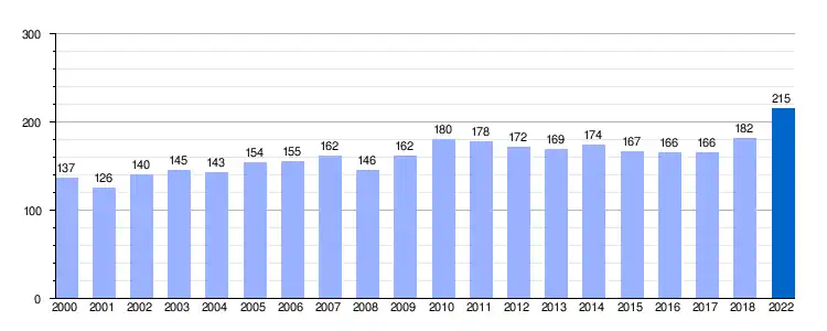 | Gráfica de evolución demográfica de Entrambasaguas entre 2000 y 2022 |