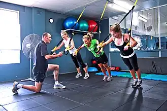 El entrenamiento en suspensión es una forma de entrenamiento funcional (para cualquier actividad deportiva o de la vida cotidiana) que se lleva a cabo con un arnés en suspensión (sistema de cables y cintas) sujeto por un punto de anclaje, este es ajustable y no elástico, fabricado de materiales diversos pero resistentes (siendo el más típico el nailon),del punto de anclaje salen dos cuerdas con agarres mediante las cuales realizaremos los movimientos. Este entrenamiento permite realizar ejercicios multidimensionales, útiles, eficaces y seguros con el propio peso corporal y la fuerza de la gravedad, que desarrollan la fuerza y al mismo tiempo mejora la flexibilidad, equilibrio y la estabilidad de la parte central del cuerpo (core).[1]
