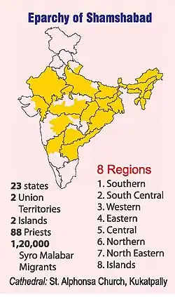 En 2023 en la entonces eparquía existían 59 parroquias. En esta eparquía confluyeron las misiones siro-malabares existentes en las diócesis latinas de la India: arquidiócesis de Agra (Etawah Mission en Agra, Uttar Pradesh, con 11 centros de misa), diócesis de Ahmedabad (Syro-Malabar Community en Ahmedabad, Guyarat, con 12 centros de misa), diócesis de Aurangabad (St.Joseph Syro-Malabar Church en Aurangabad, Maharastra, con 3 centros de misa), arquidiócesis de Bangalore (Syro Malabar Bangalore Mission con 22 parroquias personales y 21 centros de misa, en Karnataka), diócesis de Baroda (Syro-Malabar Community en Vadodara, con 1 parroquia y 11 centros de misa en Guyarat), arquidiócesis de Bhopal (Syro-Malabar Church, Bhopal en Bhopal, Madhya Pradesh), arquidiócesis de Madrás y Meliapor, arquidiócesis de Goa y Damán (Syro Malabar Catholic Church, Goa en Altinho-Panaji con 2 centros en Goa y 1 en Damán), arquidiócesis de Hyderabad (Syro Malabar Catholic Community Welfare Association en Secunderabad, con 7 centros de misa en Andhra Pradesh), arquidiócesis de Calcuta (St. Thomas Syro Malabar Parish en Calcuta, con una parroquia y un centro de misa), diócesis de Salem (St. Mary’s Church en Salem, con 1 parroquia en Tamil Nadu) y diócesis de Vijayawada (St. Mary’s Prayer Centre en Vijayawada, Andhra Pradesh).[2]