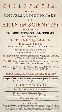 - ↑ Robert Lewis Collison reminds us that Chambers attained the distinction of "father of the modern encylopaedia throughout the world." (Encyclopaedias: Their History Throughout the Ages, 2ª ed. p.103, Hafner, New York & London, 1966.) citado en Universidad de Wisconsin