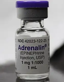 Epinefrina, también conocida como adrenalina, es un medicamento y una hormona.[1][2] Como medicamento, se usa para tratar varias afecciones, como anafilaxia, paro cardíaco y sangrado superficial.[3] La epinefrina inhalada se puede usar para mejorar los síntomas del crup.[4] También se puede usar para el asma cuando otros tratamientos no son efectivos. Se administra por vía intravenosa, por inyección en un músculo, por inhalación o por inyección justo debajo de la piel.
