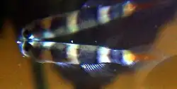 De cuerpo alargado y color a bandas verticales blancas y negras y cola roja, de tamaño pequeño con una longitud máxima del macho de unos 4 cm.[3]