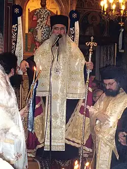 Cuando el obispo es plenamente ordenado viste una epitrachelion sobre la sticharion y debajo, la sakkos y el Omoforio.