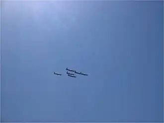 - Cruzando la formación (los primeros 5 elementos van en formación "V" con el tren de aterrizaje abajo y el sexto pasa en sentido contrario a toda velocidad).