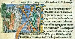 ![]() Eremaro, recibiendo la Vera Cruz de Antioquía. Tomado de Guillermo de Tiro, Histoire d'Outremner | ||