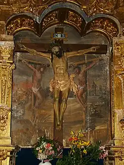El retablo es del primer cuarto del siglo XVIII y la talla del Cristo es del siglo XVI. Está ubicada en un nicho trilobulado y sobre un fondo pintado en que se perciben los dos ladrones. En los laterales hay unos ángeles metidos en hornacinas; se cree que son los que fueron hechos en 1715 por Antonio Gautúa, para el altar mayor.[3] En el ático está el grupo de la Virgen del Pópulo, con el Niño.