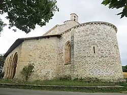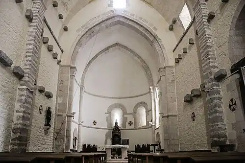 La estructura del templo contempla una sola nave con tres tramos, una cubierta de cañón y un ábside semicircular de grandes dimensiones. Hay tres ventanas en el ábside y dos de ellas son saeteras rematadas con arcos; la tercera, ubicada en el tramo sur del presbiterio, es de estilo gótico y se abrió con posterioridad. Está hecha con sillería de piedra caliza rosada. Se aprecia un buen número de arquivoltas muy apuntadas y seis columnas en cuyos capiteles se aprecian motivos vegetales y cabezas humanas, tanto masculinas como femeninas.[5][4]