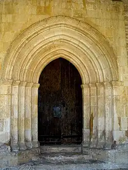 La puerta, los ventanales y el pórtico son de sillería tallada. El resto de la ermita está construido con pequeños sillarejos. La puerta de entrada al templo está en el muro meridional y se compone de un vano apuntado rodeado de cinco arquivoltas. En la decoración se combinan superficies lisas, boceles y escocias, y también amplios ajedrezados. Los apoyos son jambas, no hay columnas.[4]
