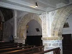 El presbiterio se encuentra separado de la nave central por una reja de hierro forjado del siglo XV. Tiene una sacristía adosada en la parte posterior de la cabecera tras el retablo, seguramente de reformas posteriores, las principales de las cuales se llevaron a cabo durante el siglo XVII. El primer tramo de la nave central, después del presbiterio, posee unas pinturas murales cubriendo toda su bóveda.[5][4]
