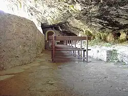 Se accede por una escalinata que sube a la cueva. Tiene una puerta abierta al sur en arco de medio punto sobre jambas de necela. Al oeste hay un vano triangular y monolítico grabado en pierda toba. En el testero hay restos de pinturas murales y de ejecución popular, a base de líneas oscuras sobre fondos blanquecinos, que representan a Adán y Eva a ambos lados del árbol del Paraíso plagado de manzanas y al que se le enrosca una serpiente con cabeza de mujer (siglo XVII). Según algunos autores, la fábrica y puerta del santuario puede considerarse, a pesar de su rudeza, como obras medievales de tradición románica tardía.[1]