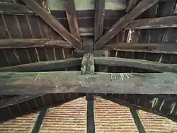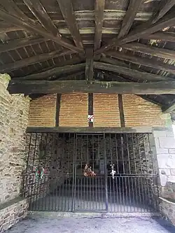 Es un amplio recinto, con escalinata de piedra en su acceso, salvando el desnivel del lugar en que la ermita se asienta. Abierto por este lado y por el costado derecho, el vuelo de su amplio tejado se apea en dos pies derechos asentados sobre el zócalo de manipostería que cierra el recinto por su costado Sur. El apoyo angular de ambos flancos se refuerza con tornapuntas sustentando el ángulo S.O. de la cubierta, que muestra su estructura de madera, a vista desde el interior del recinto porticado.[11]
