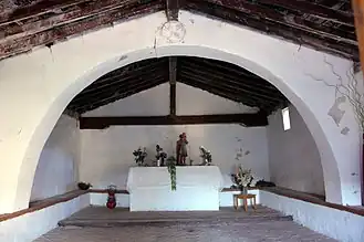 «Al fondo se observa el presbiterio, con un altar de obra adosado, las paredes están enlucidas y encaladas, un poyo corrido circunda todo el ermitorio –incluyendo el espacio presbiteral, situado un escalón por encima del piso de la nave-, siendo lo más característico los dos arcos de diafragma (en forma de medio punto) que soportan la estructura de la techumbre. En la clave del arco de cabecera, cara de la nave, puede observarse una cruz trinitaria (redondeada) labrada, idéntica a la que luce sobre la ventana del cuerpo de cabecera, lado de la epístola en la Ermita de San Marcos (antigua ermita de la Trinidad) en Veguillas de la Sierra...».[4]Tormón, pueblo de Teruel, Alfredo Sánchez Garzón